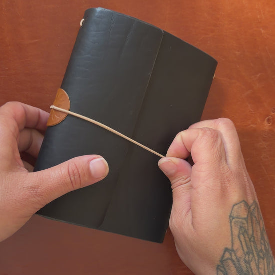 A potentially new Dame Design leather journal cover, this A6 is made from full grain Italian leather, comes with thick 2mm beige elastic bands, can hold up to 4 notebooks sized A6 and smaller, and has a black in kuiki pattern on the inside (typically used in our Mohala Collection).